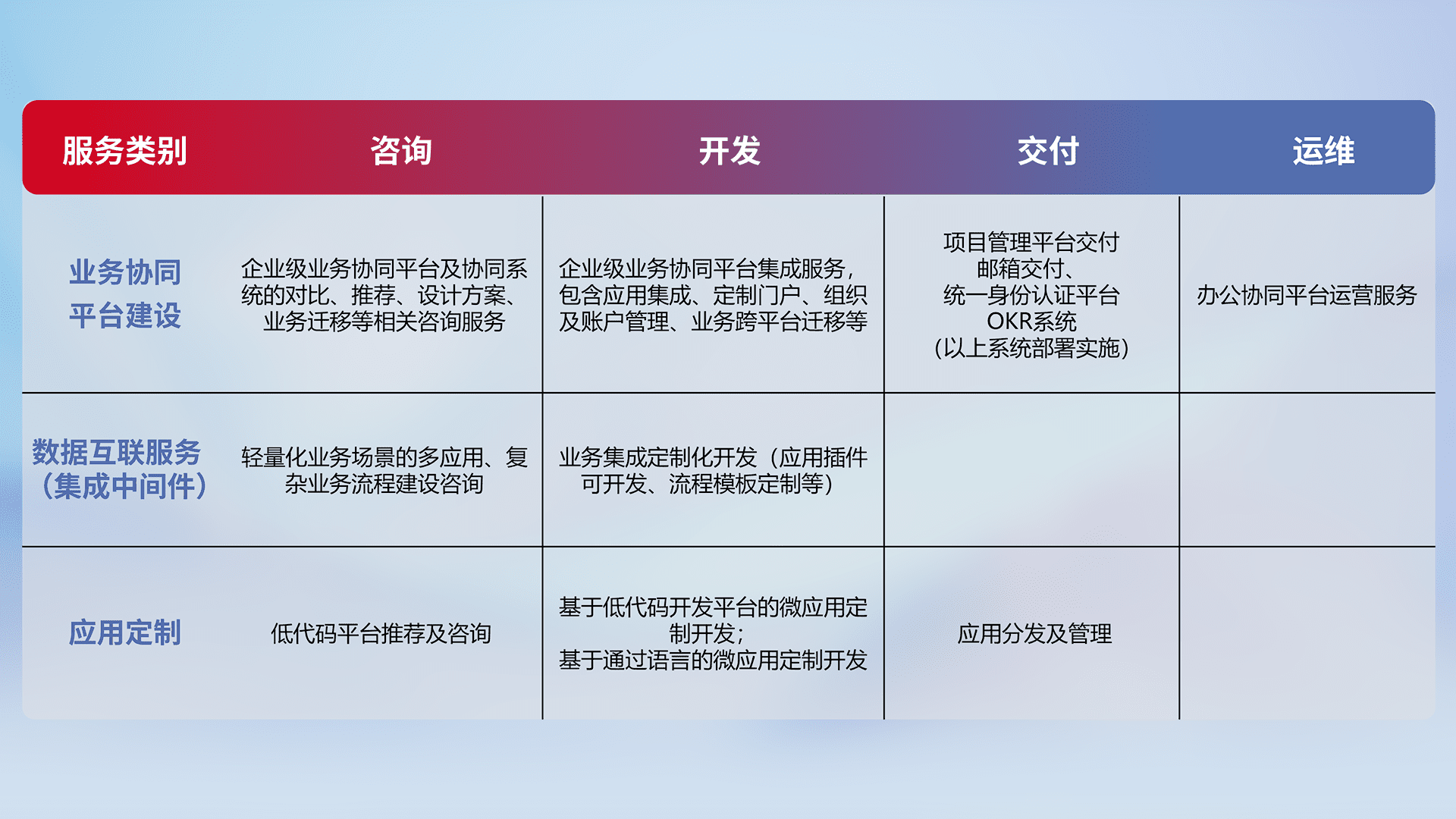 针对钉钉、、、企微、、、IDaas等平台级产品提供产品的规划、、、方案、、、交付、、、定制化开发等服务,,,,实现如统一协同办公、、、、智能客户服务、、、混合会议管理、、、、智能数据查询、、、等业务场景,,,实现数字化转型。。。。